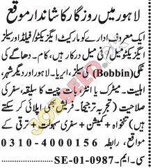 Join a reputable organization as a Sales Executive in Lahore, specializing in selling Bobbin threads. This opportunity is open to both male and female candidates. Candidates with strong communication skills and experience are highly encouraged to apply. The company provides competitive compensation, including commission, travel benefits, and opportunities for advancement. Latest job openings for a sales executive in the private sector.