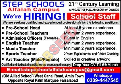 Discover rewarding career paths in education with STEP SCHOOLS Alfalah Campus, a distinguished institution under the Punjab Group of College. We are recruiting for various school staff positions, including Pre-School Head, Pre-School Teachers, Admission Officers, English Teachers, Music Teachers, Sports Teachers, and Art Teachers. Ideal candidates will possess relevant qualifications and experience, contributing to our commitment to 21st-century learning. This is a prime opportunity for individuals seeking stable employment and professional growth within the private education sector in Faisalabad.