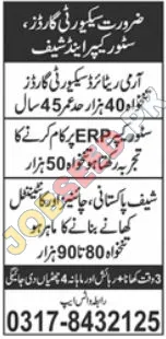 A private sector firm is actively seeking dedicated professionals for Security Guard, Storekeeper, and Chef positions. Benefit from the competitive compensation packages, including salaries up to PKR 90,000, along with the convenience of provided food, accommodation, and monthly holidays. These roles offer a promising career path with the potential for career development. Apply today to secure a rewarding role.