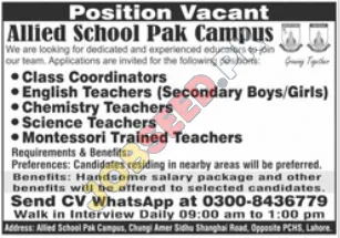 Allied School Pak Campus is hiring Teachers and Class Coordinators in Lahore. This private sector school offers competitive compensation and fantastic benefits. If you're looking for employment in the education field, explore our latest job vacancies. We are committed to attracting qualified professionals for our ongoing hiring process. This is the perfect opportunity to further your career in education sector.