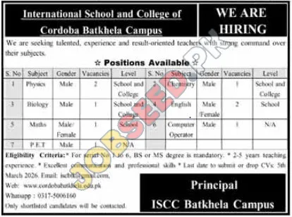 International School and College of Cordoba Batkhela Campus is actively searching for dedicated and proficient teachers to join its esteemed educational institution. This private sector school is offering significant career opportunities in various subjects. Embrace this chance to leverage high CPC keywords within an engaging description. This position represents excellent immediate vacancies in the region. Apply by March 5th, 2026! This position represents excellent International School and College of Cordoba Batkhela Campus jobs in Batkhela in the region.