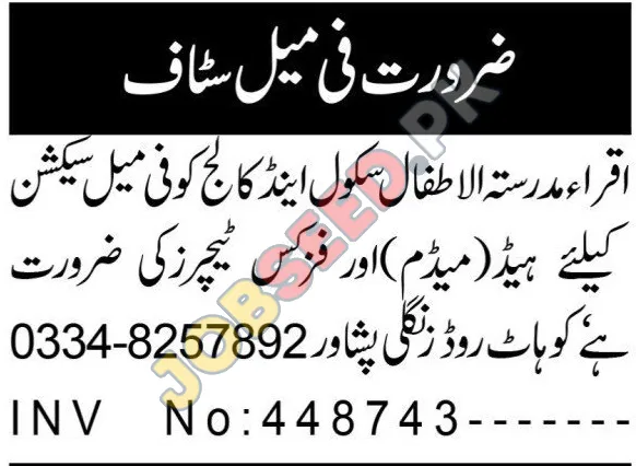 | Job Hiring Organization: | Iqra Madrassa Al Atfal School & College |