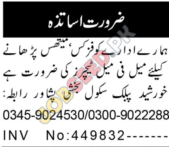 Khorsheed Public School in Peshawar is seeking dedicated male and female teachers to instruct Physics and Mathematics. This announcement presents excellent employment options for educators, offering a chance to join a reputable private school. This position represents excellent latest jobs in the region. Apply now to pursue a teaching career and contribute to students' academic success.