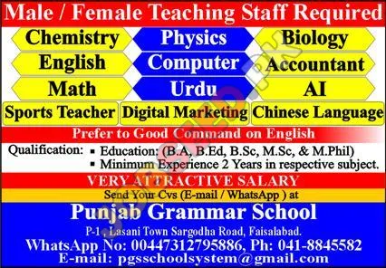 Punjab Grammar School, a well-established private educational institution, is seeking enthusiastic and qualified teachers for various subjects. This is a great opportunity for educators to join a dynamic and supportive environment. If you're passionate about teaching and possess the required qualifications, we encourage you to apply for these rewarding teaching positions. Enjoy a competitive salary and the potential for professional growth!