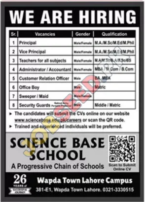 Science Base School is looking for qualified educators and administrative staff in Lahore. Successful candidates will benefit from these Apply for Teacher in Lahore. The positions include Principal, Vice Principal, Teachers for diverse subjects, Administrator/Accountant, Customer Relation Officer, Office Boy, Sweeper/Maid and Security Guards. Candidates with experience are encouraged to submit their CVs through the online portal. These job openings provide opportunities for professional advancement within the private education sector.