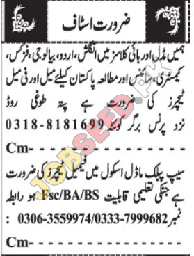 Sep Public Model School in Quetta is looking for passionate educators to join their team. They are hiring teachers for various subjects, including English, Urdu, Biology, Physics, Chemistry, Science, and Pakistan Studies for middle and high school classes. Positions are available for both male and female teachers.