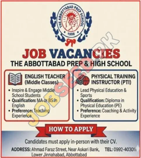 The Abbottabad Prep & High School is actively seeking dedicated educators to join their esteemed institution. Additionally, Apply for Teacher in Abbottabad are available for qualified candidates. We are looking for passionate individuals to fill critical teaching roles, offering a chance for professional growth within a reputable private sector school. This is an excellent opportunity for experienced teachers to contribute to student development and advance their careers in education. Discover rewarding teaching jobs in Abbottabad with competitive benefits.