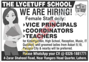 The Lycetuff School, a well-established private educational institution, is actively seeking talented female professionals to join its team in Lahore. We are hiring for multiple positions, including Vice Principals, Coordinators, and Teachers. If you are a qualified and enthusiastic individual, we invite you to explore the available career opportunities within our institution. We are seeking well-groomed ladies for these positions.- Vice Principals: Oversee the academic and operational aspects of the school.