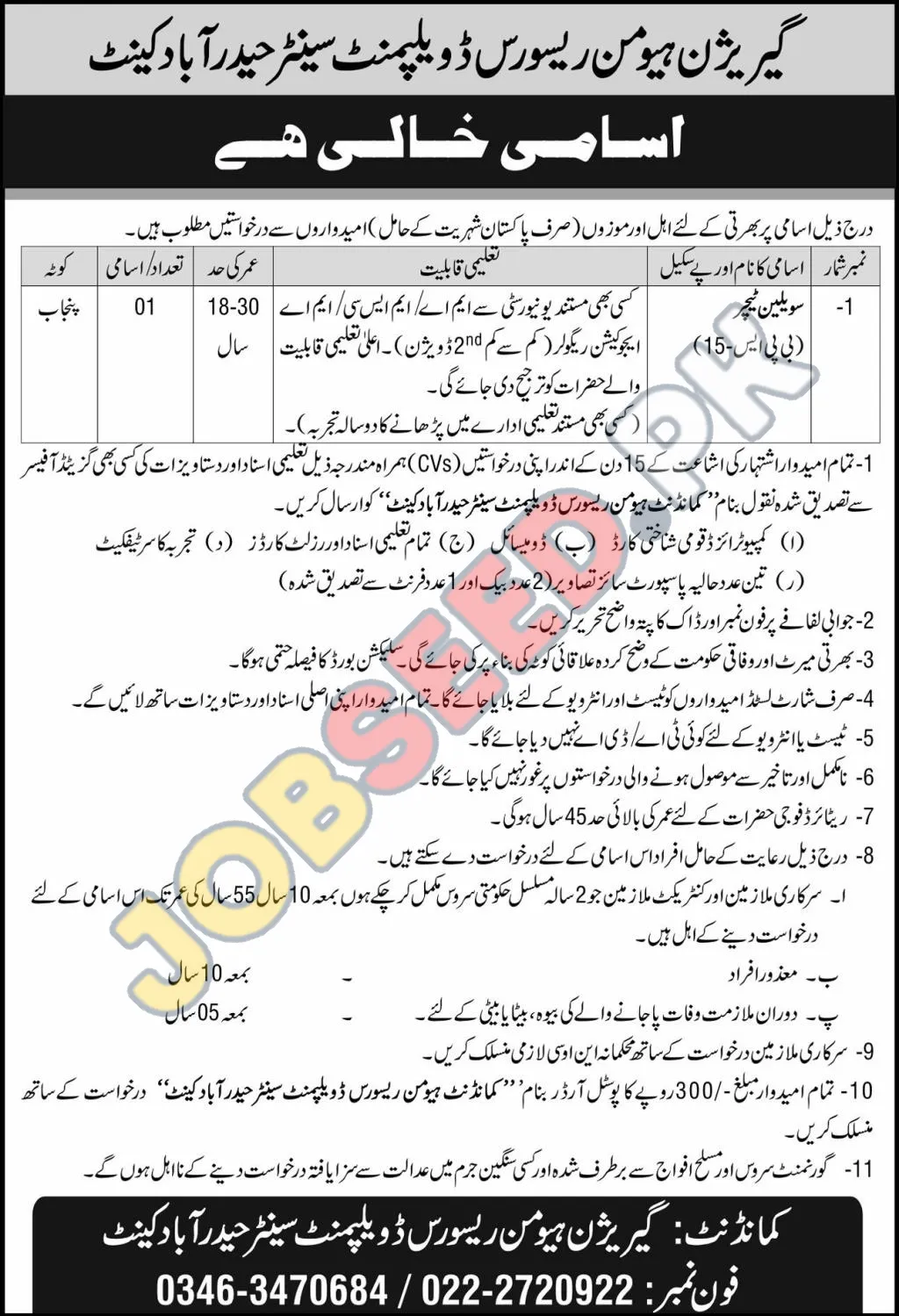 The Garrison Human Resource Development Centre in Hyderabad Cantt is seeking dedicated professionals for a Teacher position. This job opening provides exceptional career opportunities within the education sector, offering a professional work environment with opportunities for continuous growth. Applicants are encouraged to apply immediately to secure their application in a highly competitive job market. This role offers a competitive salary and excellent opportunities for career development .