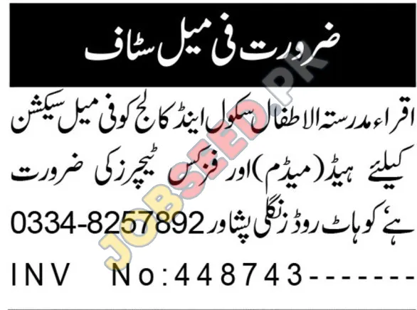 Iqra Madrasa-tul-Atfal School & College in Peshawar is offering exciting career opportunities for experienced and enthusiastic teaching professionals. The school is looking for a Head (Madam) and Physics Teachers. This presents a great opportunity to be part of a leading educational institution. These teaching positions offer competitive salaries and a supportive work environment.