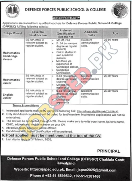 Defence Forces Public School & College (DFPS&C) is currently hiring Teachers for various subjects. Applications are invited from individuals holding relevant qualifications and experience. The positions offer a competitive salary and excellent benefits. Explore these vacancies with competitive benefits. Apply before the deadline.