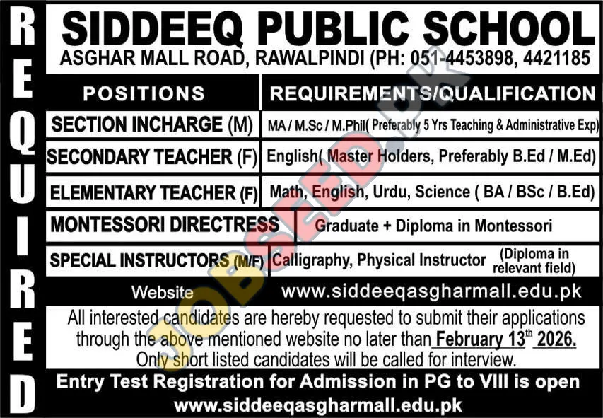 Siddeeq Public School in Rawalpindi has announced several teaching vacancies for dedicated educators. The school is inviting applications from qualified candidates for various teaching positions. The advertisement focuses on attracting skilled professionals to fill these roles.