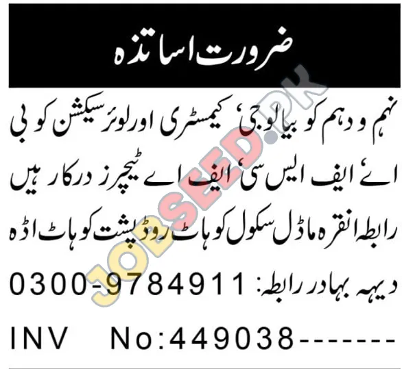 An established school in Kohat is advertising a number of teaching jobs for qualified candidates. This is a great chance for educators to find new employment in the private sector. Explore various employment opportunities, including jobs for biology and chemistry teachers.