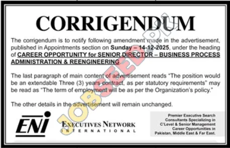 Executive Network International ENI, Karachi Sindh Pakistan invites applications from eligible candidates for the post of Senior Director – Business Process Administration & Reengineering as per advertisement of 18 December, 2025, published in Jang Newspaper. Master educational qualification will be preferred.