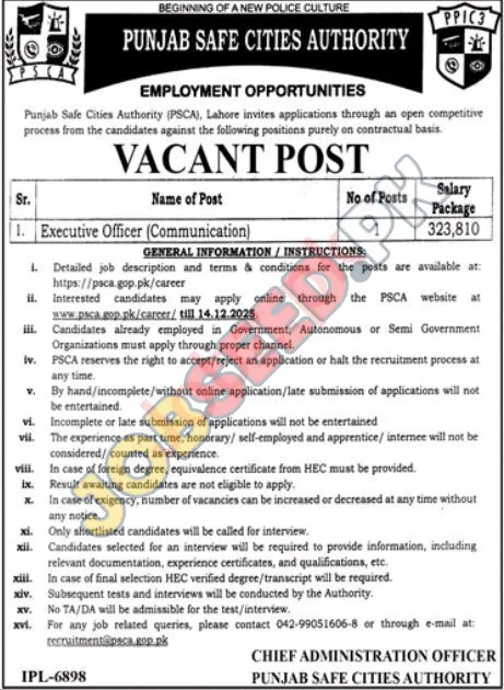 Punjab Safe Cities Authority PSCA is now recruiting in Lahore. Apply for the position of Executive Officer (Communication). The required qualification is Master. This role is within the Management industry. The application process commenced on 01 December, 2025 via Jang Newspaper. Interested and eligible candidates must submit their applications before the deadline on 14 December, 2025. This is a prime opportunity to join a renowned organization. For a step-by-step application guide and full eligibility criteria, please see the official advertisement on https://www.jobseed.pk.