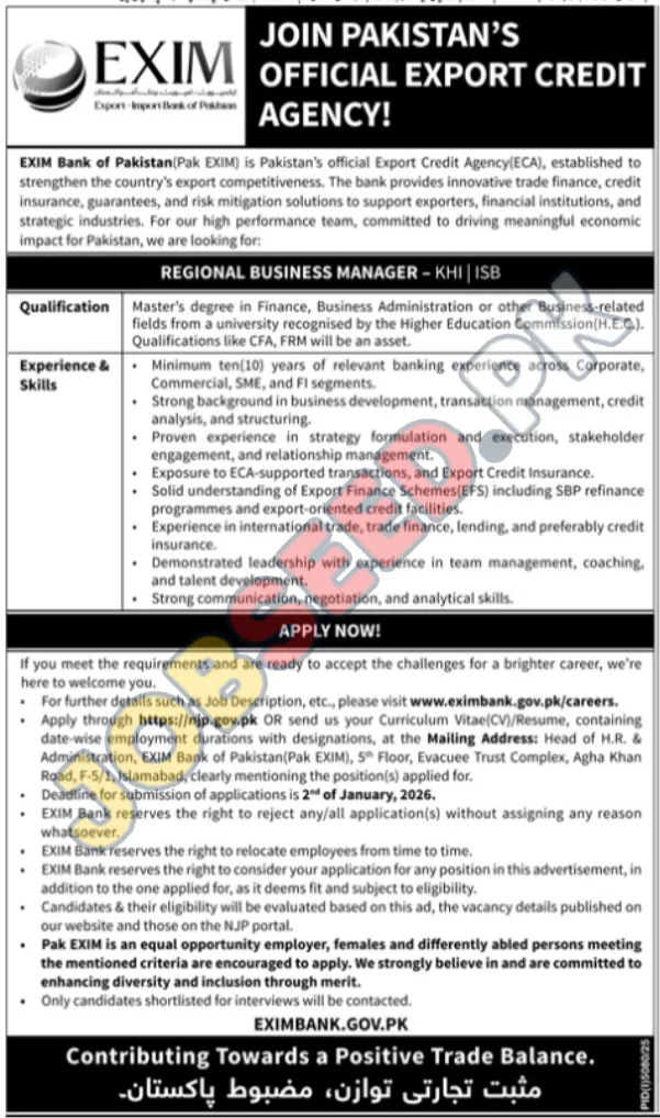 Exim Bank of Pakistan, Karachi Sindh Pakistan invites applications from eligible candidates for the post of Regional Business Manager as per advertisement of 19 December, 2025. Master educational qualification will be preferred.