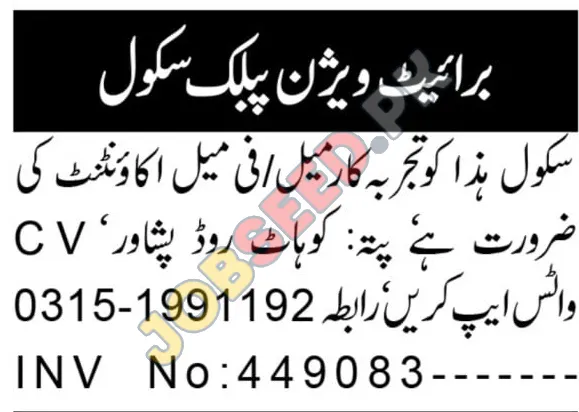 Experienced Accountant Job Vacancy at Bright Vision Public School Peshawar