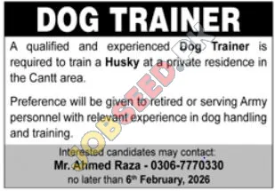 Seeking a skilled and seasoned Dog Trainer to provide specialized training for a Husky at a private residence located in the Cantt area. This role offers a unique opportunity for individuals with a passion for animal behavior and a proven track record in canine education. We are particularly interested in candidates with prior experience in dog handling and training, especially those who are retired or currently serving Army personnel. This position emphasizes professional development and the chance to work with a specific breed, contributing to its well-being and obedience. Discover rewarding career paths in animal care and training.