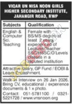Viqar Un Nisa Noon Girls Higher Secondary Institute in Jahangir Road, RWP, is looking for experienced English and Computer Science Teachers. The candidates should have a BS/MS degree with at least two years experience in a reputed institution. This is an exciting chance to join the education sector and build a flourishing career. Explore these job openings with competitive benefits. Find the latest jobs and career opportunities within a nurturing environment. Competitive salary and professional growth await qualified candidates.