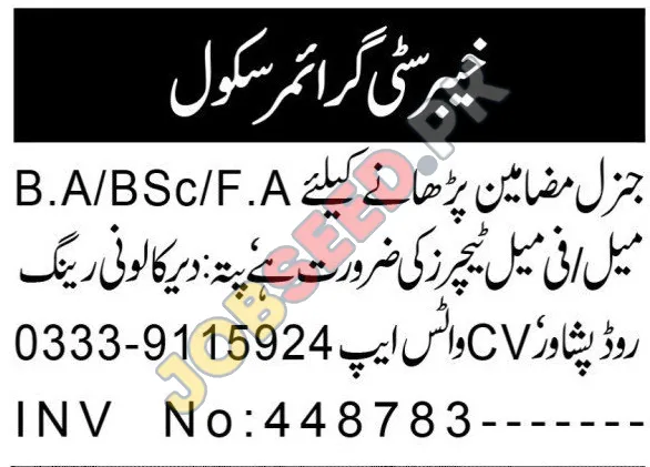 Khyber City Grammar School, a reputable private school, is looking for dedicated and experienced male teachers to teach general subjects. This job opening provides an excellent chance to join the education sector in Peshawar. The school is inviting applications from qualified candidates holding B.A or B.Sc degrees. Explore a fulfilling career opportunity and apply today!