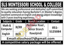 SLS Montessori School & College seeks qualified teachers for Math & Computer and English subjects in Rawalpindi. Ideal candidates possess a Bachelor's or Master's degree, 3 years of teaching experience, and excellent English communication skills. This private sector institution offers a competitive salary and professional development for educators. Additionally, government jobs are available for qualified candidates. Explore new teaching job openings and advance your career in education.