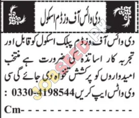 Wisdom Public School is looking for qualified and experienced Teachers. The ideal candidates will be enthusiastic and dedicated to creating a positive learning environment. This is a great opportunity to join a reputable private sector institution with attractive benefits. The school is inviting applications from experienced educators for various teaching positions.