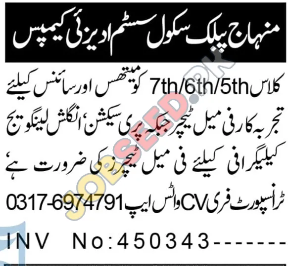 Minhaj Public School System is actively seeking dedicated and qualified teachers to join their esteemed educational institution. This private sector school is looking for educators proficient in English language and experienced in teaching grades 5th, 6th, and 7th. If you are passionate about shaping young minds and possess a strong command of the English language, this is an excellent opportunity for career development and professional growth. We are committed to providing a supportive work environment for our faculty.