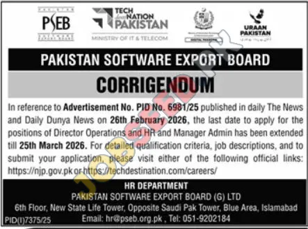 The Pakistan Software Export Board (PSEB) has announced extensions for applications in various roles. This private sector company provides employment opportunities within its organization, located in Islamabad. Apply for government jobs with vacancies in Director Operations, HR and Manager Admin roles. This is an invitation to secure an employment opportunity with a chance for professional growth.