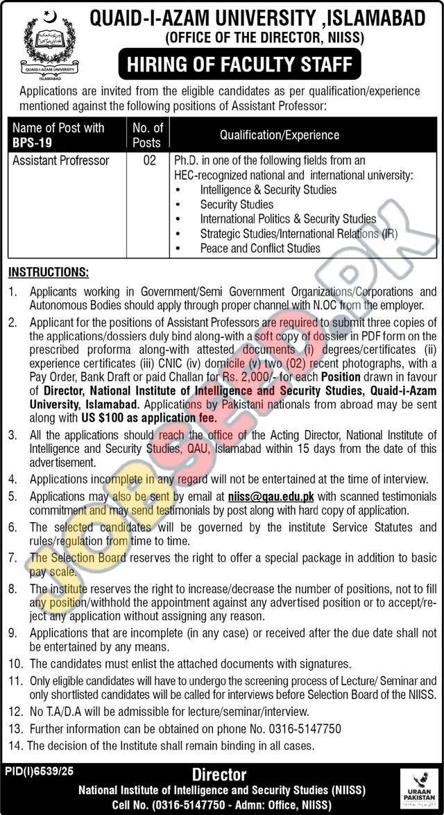 Seeking motivated academics for Assistant Professor positions at the National Institute of Intelligence and Security Studies (NIISS), a government entity under Quaid-i-Azam University, Islamabad. This presents an excellent opportunity to contribute to research in the fields of intelligence and security. NIISS offers a competitive environment to foster professional growth for qualified candidates. Experience the benefits of working in Islamabad, with the potential for career development and a high-impact role. Apply today for these exciting job openings!