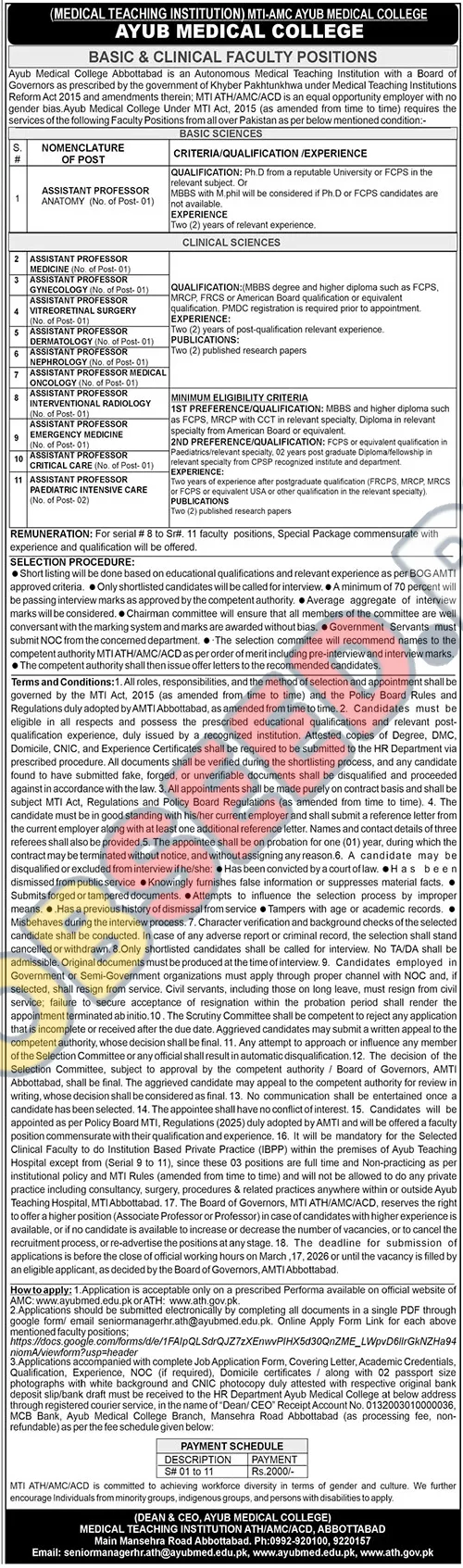 - Submission of Documents: All submitted documents must be received by the HR Department Ayub Medical College at the address below through registered courier service: Dean/CEO Receipt Account No. 0132003010000036, MCB Bank, Ayub Medical College Branch, Mansehra Road Abbottabad.