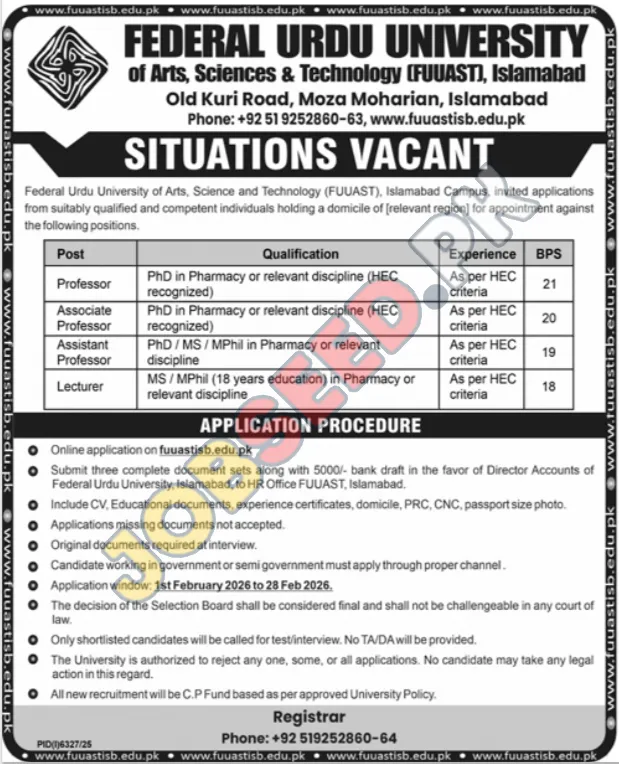 The Federal Urdu University of Arts, Sciences & Technology (FUUAST) in Islamabad, a government institution, is currently recruiting qualified candidates for various faculty positions. This job opening presents a unique opportunity for individuals with PhD or Master's degrees in Pharmacy or related fields, offering competitive salaries and the chance to contribute to a leading educational institution. The positions offer great career prospects in the public sector with chances for academic and professional growth.