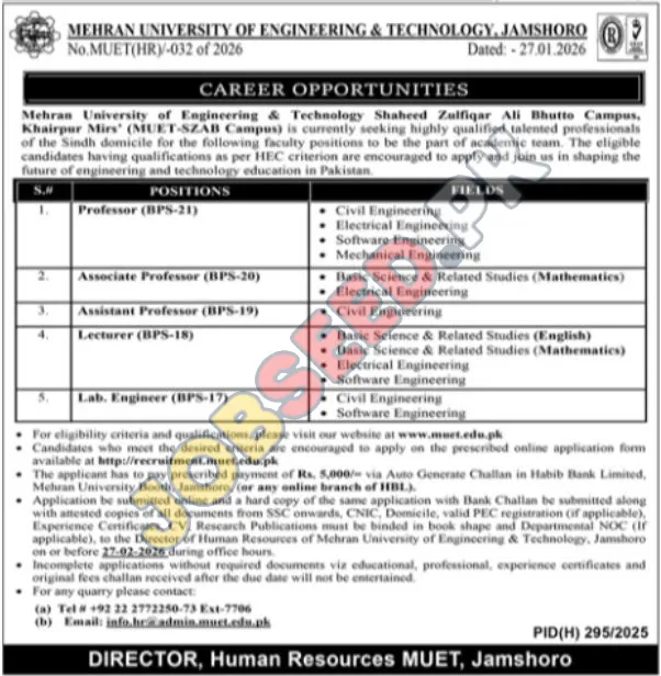 Mehran University of Engineering & Technology (MUET) is actively hiring for faculty positions at its Shaheed Zulfiqar Ali Bhutto Campus, Khairpur Mirs'. MUET seeks highly qualified and talented individuals who want a role in the academic team. These positions are a great opportunity for career development in engineering and technology education.