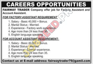 Join the team at FAIRWAY TRADER in . They are seeking to hire 2 qualified individuals for the roles of Factory Assistant and Account Assistant. This is a full-time position. This career opportunity was advertised on 25 December, 2025. The last date to apply is 06 January, 2026. Don't miss this chance to advance your career with FAIRWAY TRADER. For more information and to apply online, visit https://www.jobseed.pk.