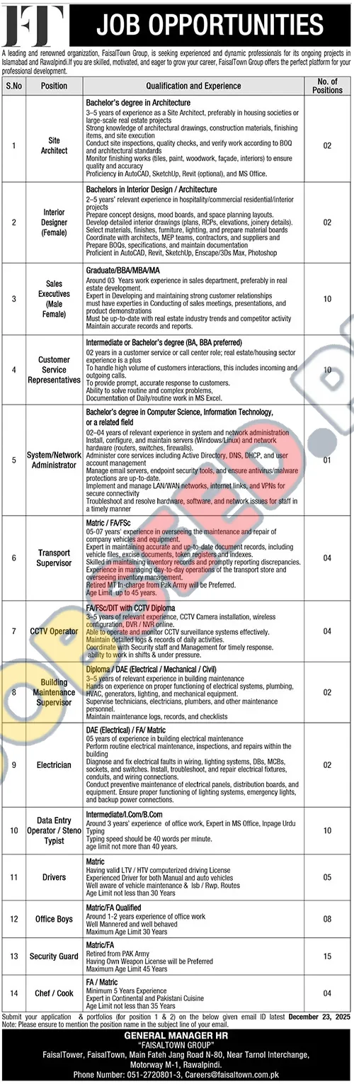 Faisal Town Private Limited, Rawalpindi Punjab Pakistan invites applications from eligible candidates for the post of Site Architect, Interior Designer (Female), Sales Executives (Male & Female), Customer Service Representatives, System/Network Administrator, Transport Supervisor, CCTV Operator, Building Maintenance Supervisor, Electrician, Data Entry Operator/Steno Typist, Drivers, Office Boys, Security Guard and Chef / Cook as per advertisement of 16 December, 2025. Bachelor, BA, Matric, Diploma, DAE, Intermediate educational qualification will be preferred.
