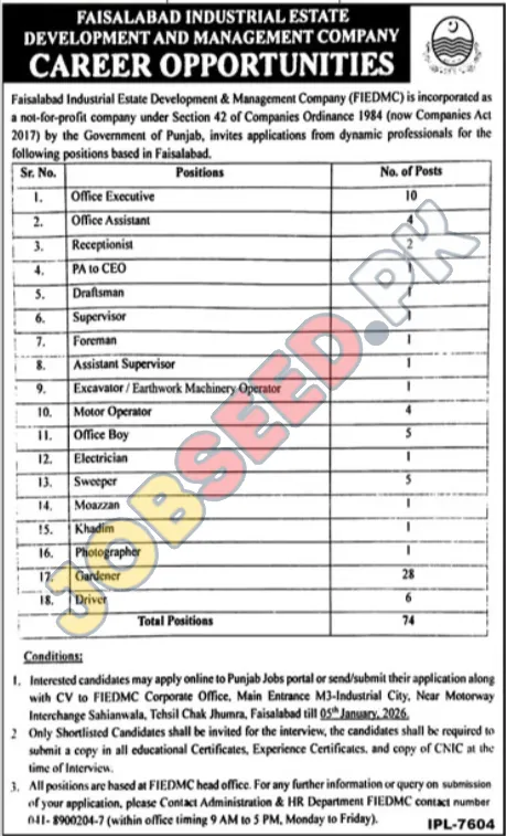 Faisalabad Industrial Estate Development & Management Company FIEDMC, Faisalabad Punjab Pakistan invites applications from eligible candidates for the post of Office Executive, Office Assistant, Receptionist, PA to CEO, Draftsman, Supervisor, Foreman, Assistant Supervisor, Excavator / Earthwork Machinery Operator, Motor Operator, Office Boy, Electrician, Sweeper, Moazzan, Khadim, Photographer, Gardener and Driver as per advertisement of 18 December, 2025, published in Jang Newspaper. Bachelor, Intermediate, Diploma, Primary, Literate, Middle educational qualification will be preferred.