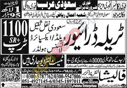 Falisha Enterprises, Riyadh Saudi Arabia Pakistan invites applications from eligible candidates for the post of Trailer Driver as per advertisement of 04 December, 2025, published in Express Newspaper. Matric educational qualification will be preferred.