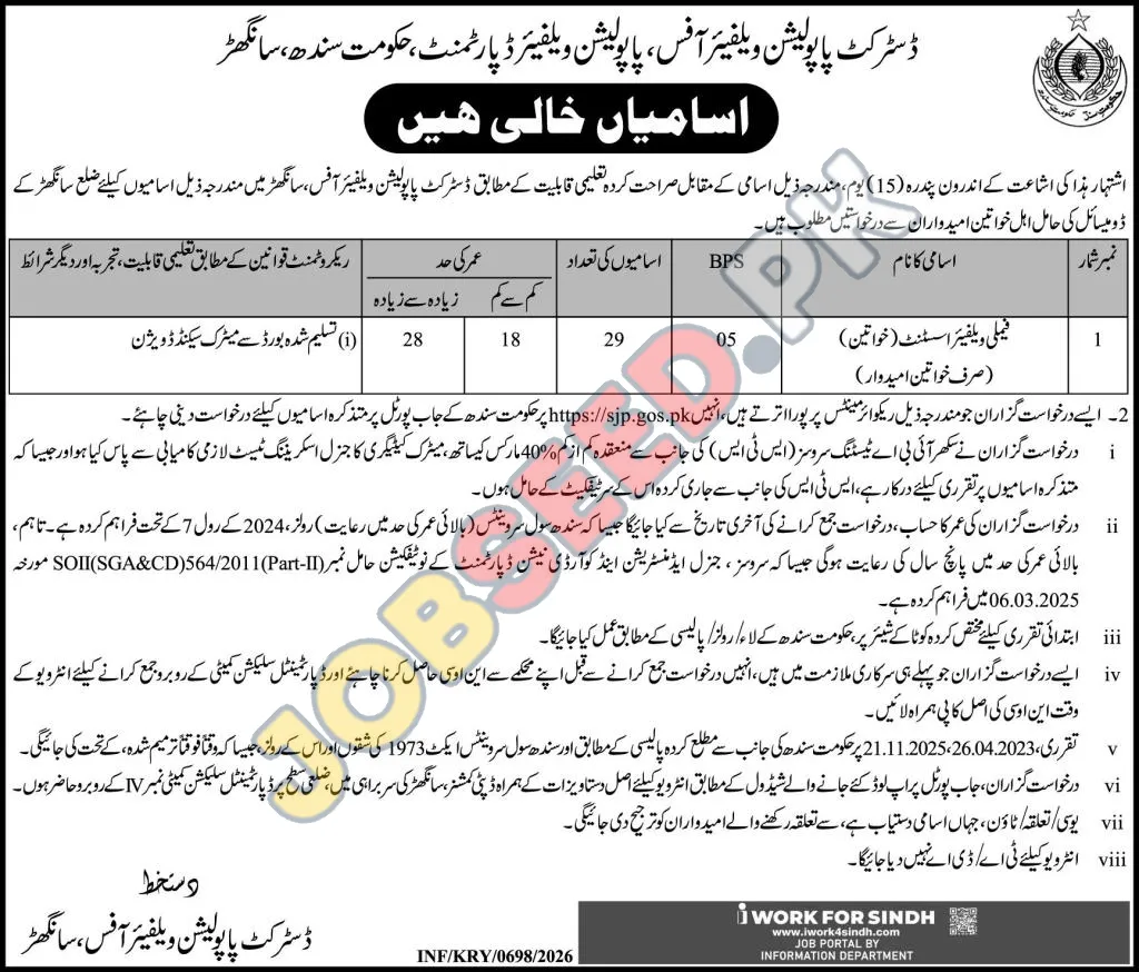 | Job Hiring Organization: | District Population Welfare Office, Population Welfare Department, Government of Sindh, Sanghar |