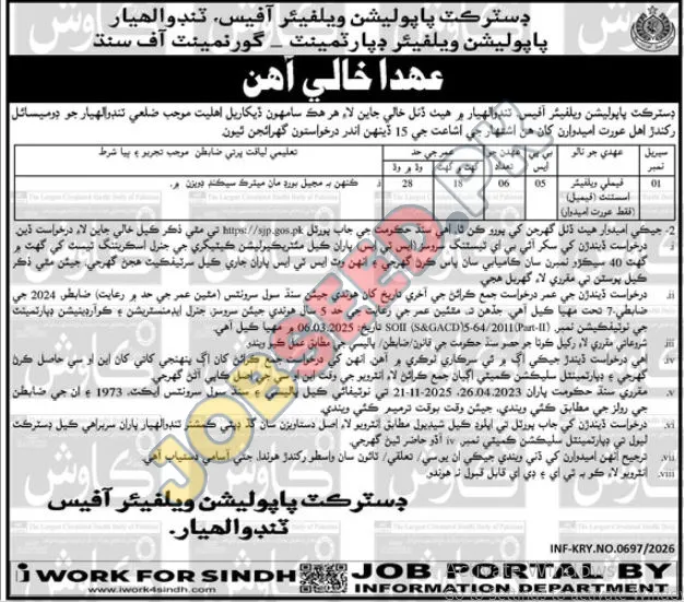 The District Population Welfare Office, Tando Allahyar, is seeking applications from eligible female candidates domiciled in the district for various Family Welfare Assistant positions. This government organization is offering career opportunities for individuals with specific qualifications. A competitive salary and the potential for professional growth are available. Apply within 15 days of the advertisement's publication. The ideal candidate will have the education required and relevant experience. The application process involves submitting an application. The selected candidates will have the opportunity for career development. Apply now for this exciting employment opportunity!