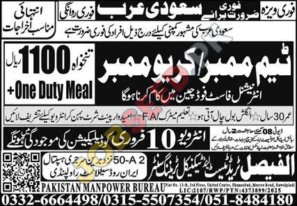 Explore new career opportunities in the fast food sector with immediate hiring for Crew Members in Saudi Arabia. This position is open to candidates with a high school education (Matric/FA) and basic English proficiency. The role offers a competitive salary and benefits package, including a daily meal. Interested applicants are invited to attend walk-in interviews at the specified location in Rawalpindi, Pakistan, for immediate processing and deployment to Saudi Arabia.