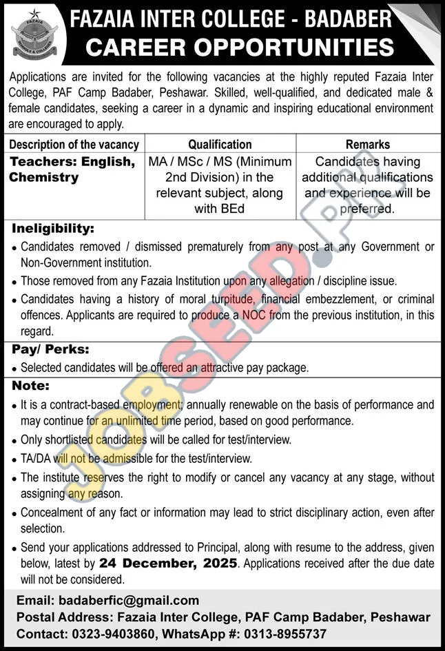 Fazaia Inter College, Peshawar Khyber Pakhtunkhwa KPK Pakistan invites applications from eligible candidates for the post of Teachers: English, Chemistry as per advertisement of 15 December, 2025, published in Express Newspaper. Master educational qualification will be preferred.