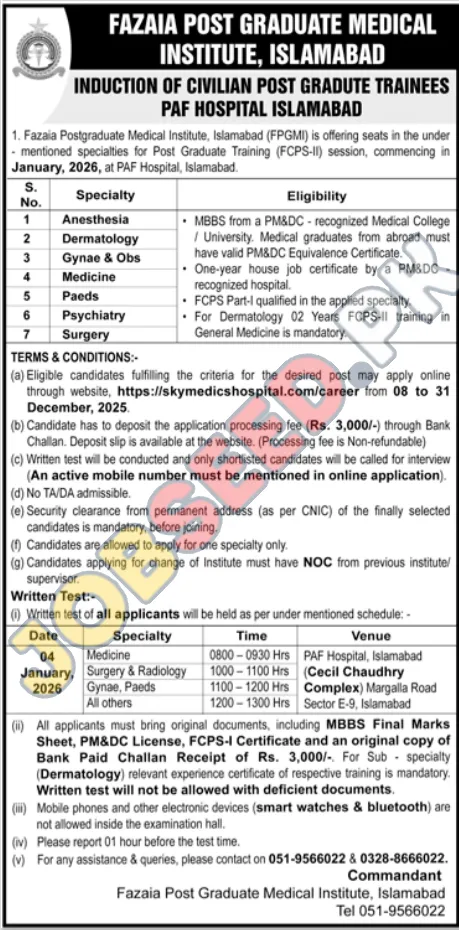 Fazaia Post Graduate Medical Institute, Islamabad Islamabad Pakistan invites applications from eligible candidates for the post of Postgraduate Trainee - Anesthesia, Postgraduate Trainee - Dermatology, Postgraduate Trainee - Gynae & Obs, Postgraduate Trainee - Medicine, Postgraduate Trainee - Paeds, Postgraduate Trainee - Psychiatry and Postgraduate Trainee - Surgery as per advertisement of 07 December, 2025, published in Jang Newspaper. MBBS educational qualification will be preferred.