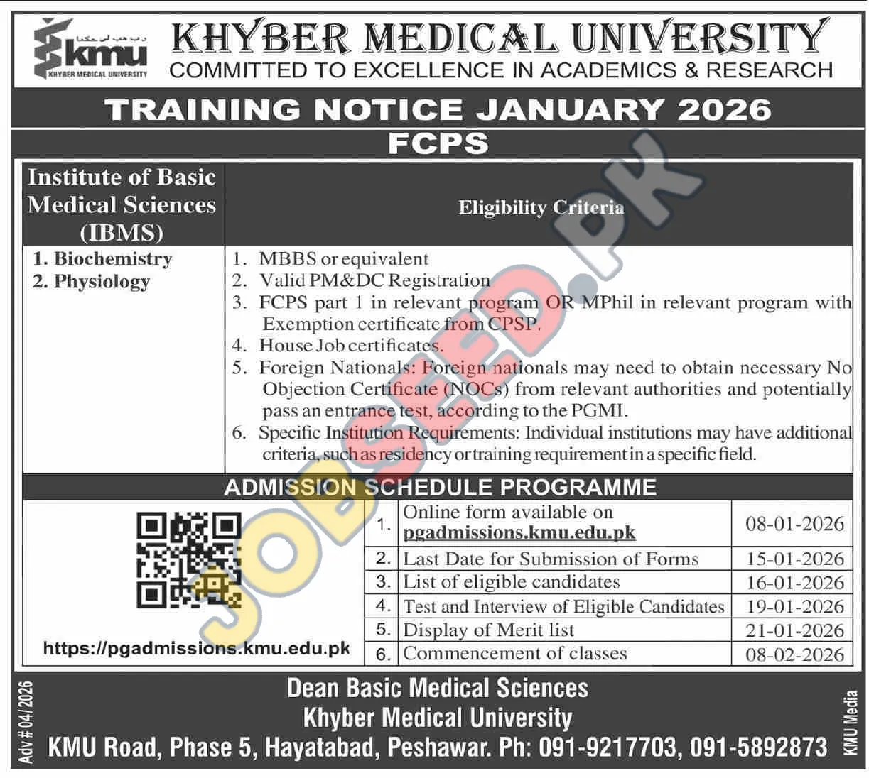Khyber Medical University, Peshawar invites applications from eligible candidates for the post of Biochemistry FCPS Trainee and Physiology FCPS Trainee as per advertisement of 08 January, 2026, published in KMU Media. BSC educational qualification will be preferred.
