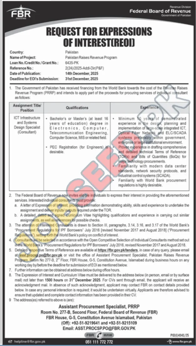 Interested candidates are invited to submit their Expression of Interest (EOI) for the ICT Infrastructure and Systems Design Specialist position to the Federal Board of Revenue (FBR) by December 31, 2025, until 1500 hours. Please follow the detailed instructions below to ensure your application is complete and correctly submitted: