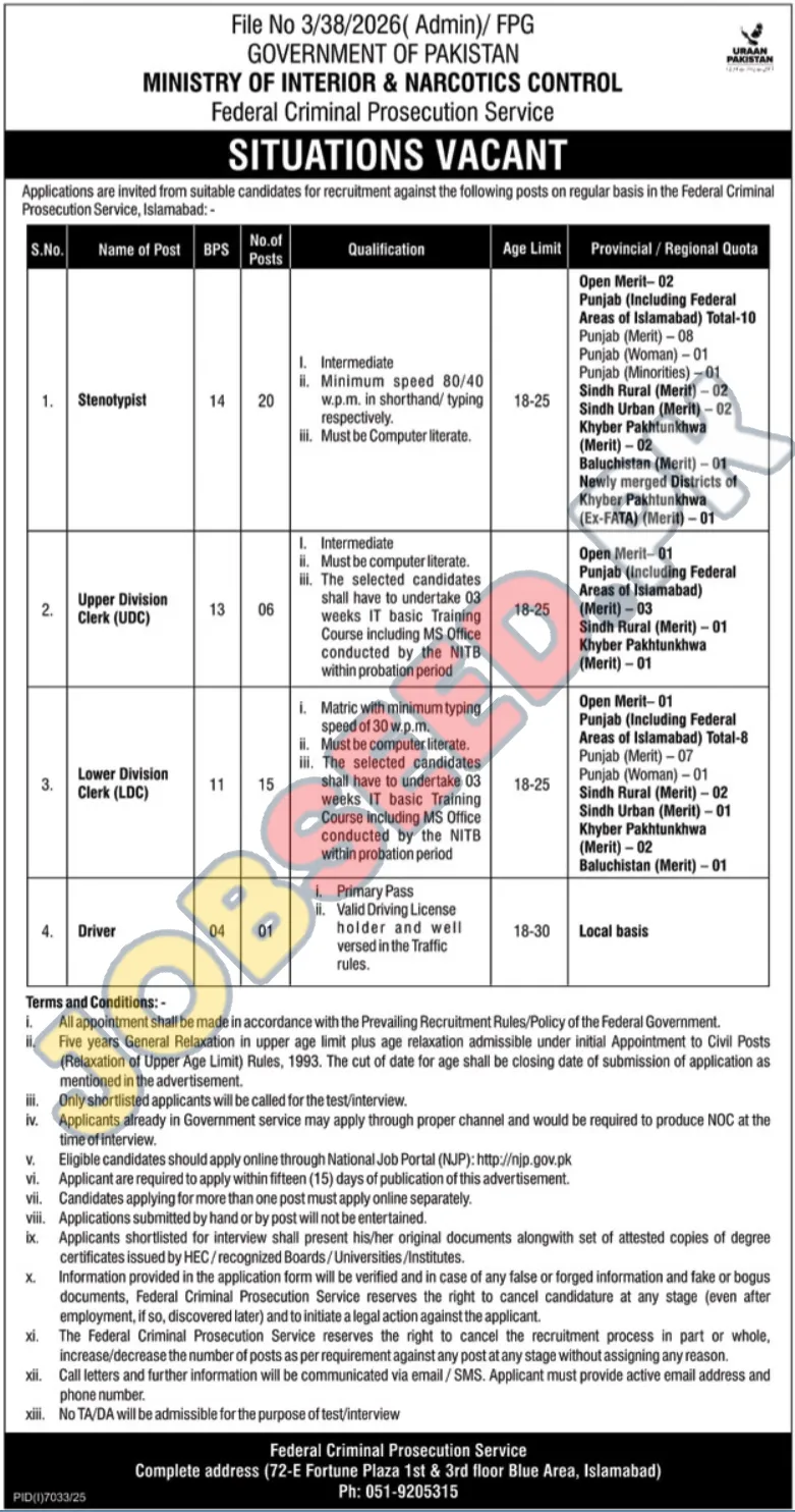 Government job openings in Pakistan with the Federal Criminal Prosecution Service. This public sector organization is hiring for roles including Stenotypist, Upper Division Clerk (UDC), Lower Division Clerk (LDC), and Driver. Candidates will find opportunities for career advancement and stable employment. The recruitment process emphasizes merit and adherence to federal government regulations. Explore these federal government vacancies for a secure and impactful career.