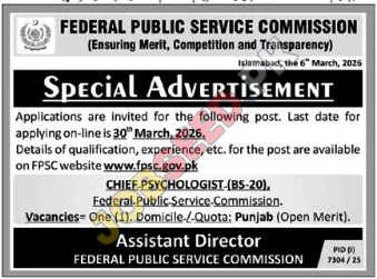 The Federal Public Service Commission (FPSC) is actively recruiting for a Chief Psychologist position in Islamabad, Pakistan. Explore these Psychologist vacancies Islamabad with competitive benefits. This government sector role is advertised with a focus on merit-based selection and transparency. Candidates interested in public service careers and psychological practice will find this a significant opportunity. The FPSC is dedicated to ensuring fair competition for all applicants seeking employment in federal government roles.