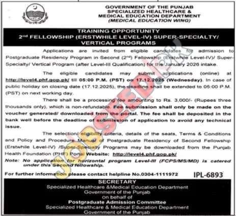 The Specialized Healthcare & Medical Education Department, Government of the Punjab, is pleased to announce opportunities for its 2nd Fellowship (Erstwhile Level-IV) Super-Specialty/ Vertical Programs. This is a fantastic chance for eligible candidates to join a Postgraduate Residency Program and advance their medical careers.