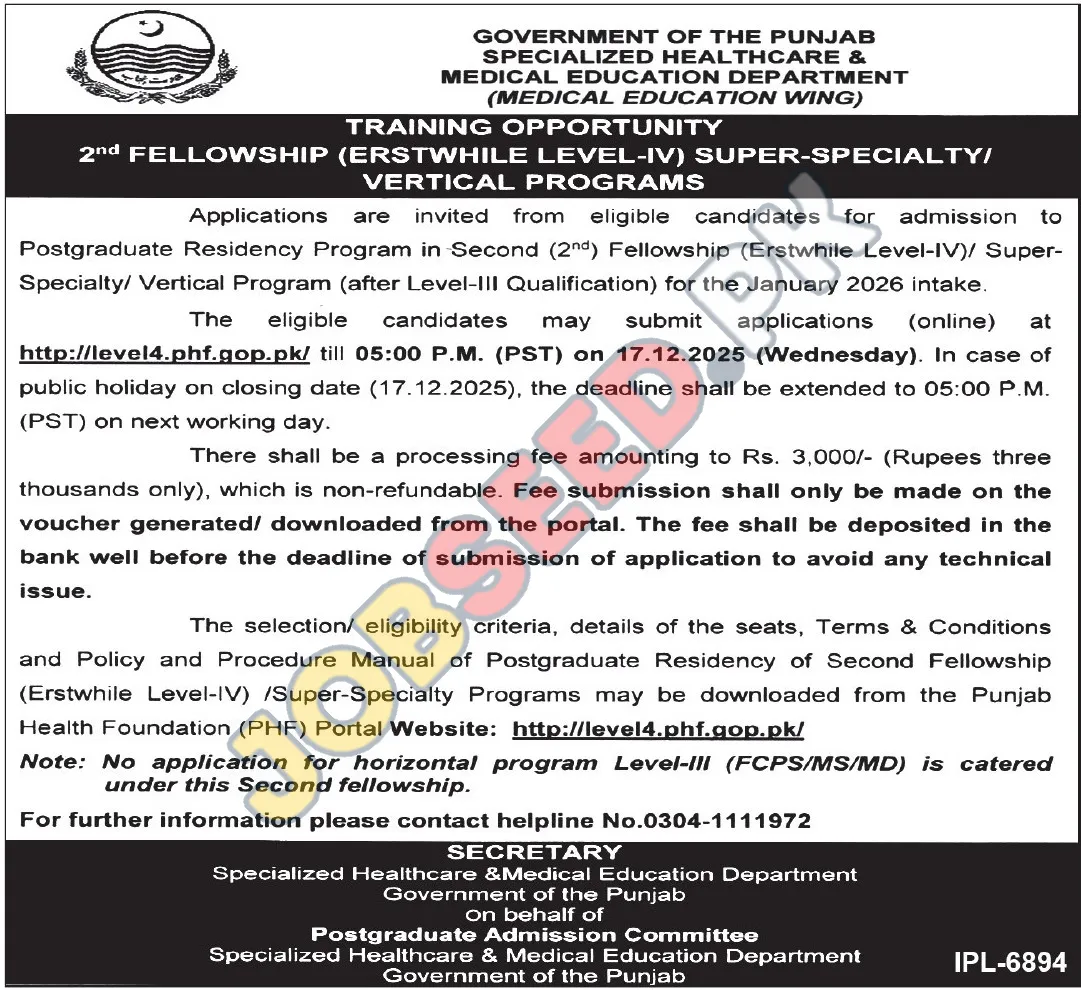 The Specialized Healthcare & Medical Education Department, Government of the Punjab, invites applications for admission to the 2nd Fellowship (Erstwhile Level-IV) Super-Specialty/ Vertical Program. This Postgraduate Residency Program provides a unique chance to enhance your medical expertise and specialize in a chosen field. Don't miss out on the chance to contribute to advanced healthcare practices.