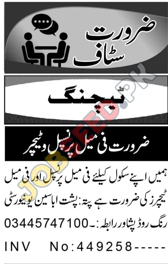 Explore the latest teaching jobs in Peshawar for female educators. An educational institute near Abasyn University on Ring Road is hiring a Female Principal and Female Teachers. Find details on qualifications, responsibilities, and how to apply for these full-time career opportunities in the educational sector of Khyber Pakhtunkhwa.