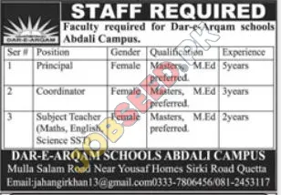 Female Principal, Coordinator, and Subject Teacher Vacancies at Dar-e-Arqam Schools Quetta