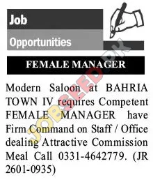 Career opportunity for a Female Manager at a modern saloon in Bahria Town IV, Rawalpindi. The position requires strong staff management skills and offers attractive commission and benefits.